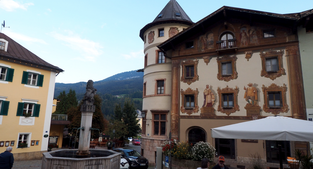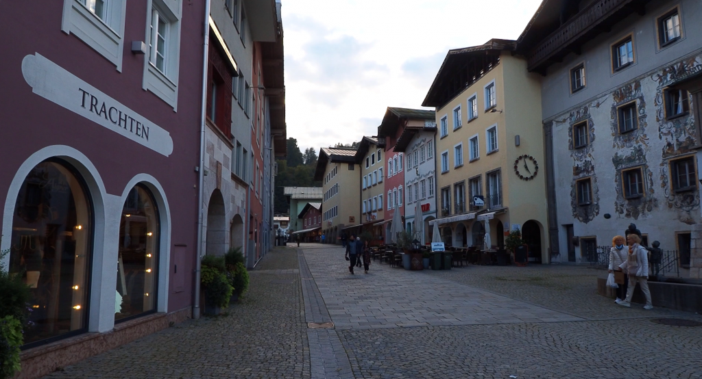 Es ist noch nicht allzu spät und so entscheiden wir uns für einen Bummel durchs 8 km entfernte Berchtesgaden. Wir haben Glück und erwischen einen Parkplatz an der Bahnhofstraße, von dem aus man in 5 Minuten mitten in der Altstadt steht. Sehr hübsch und gemütlich hier – Cafés, Gasthäuser, hübsche Geschäfte. Schon bald stehen wir am Königlichen Schloss und schauen schnell in die Schlosskirche. Barock und Gold überall, dazu einige Logenplätze an den Wänden für den Adel. Nach der obligatorischen Kerze geht es zurück zu unserem heutigen Schlafplatz in Ramsau, direkt an der Hauptstraße, aber offiziell erlaubt und mit 13 € durchaus moderat. In Berchtesgaden haben wir in das ein oder andere Gasthaus geschaut, aber vor dem morgigen Feiertag sind alle Tische belegt und wir hatten keine Chance auf ein leckeres Abendesssen.