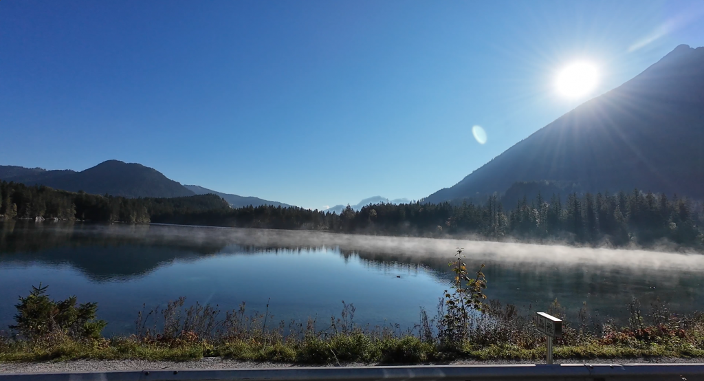 Das Wetter ist heute ein Traum und wir freuen uns auf einen tollen Tag. Zuerst geht es nochmals zum Malerwinkel bei der Pfarrkirche, danach zum Hintersee. So früh am Morgen liegen noch Nebelschwaden über dem Wasser – ein toller Anblick. Auf dem Weg nach Berchtesgaden werden wir gestoppt. Ein Almabtrieb mitten auf der großen Bundesstraße bremst alle aus und es entsteht sofort ein langer Stau. Für uns ein kleines bisschen „ärgerlich“, sind wir doch heute extra früh aufgestanden, um möglichst früh auf der Rossfeld Panoramastraße zu sein. 1 Stunde kostet uns das, dafür erleben wir hautnah, wie eine „verlorene“ Kuh eingesammelt und wieder zur Herde gebracht wird – für uns ein echtes bayerisches Erlebnis, das wir im Nachhinein nicht missen möchten. Die anschließende Fahrt Richtung Oberau ist bei dem Wetter wunderschön und alle Kameras laufen auf Hochtouren.