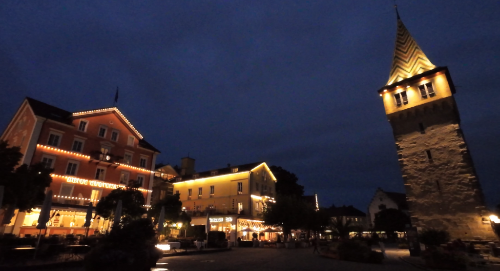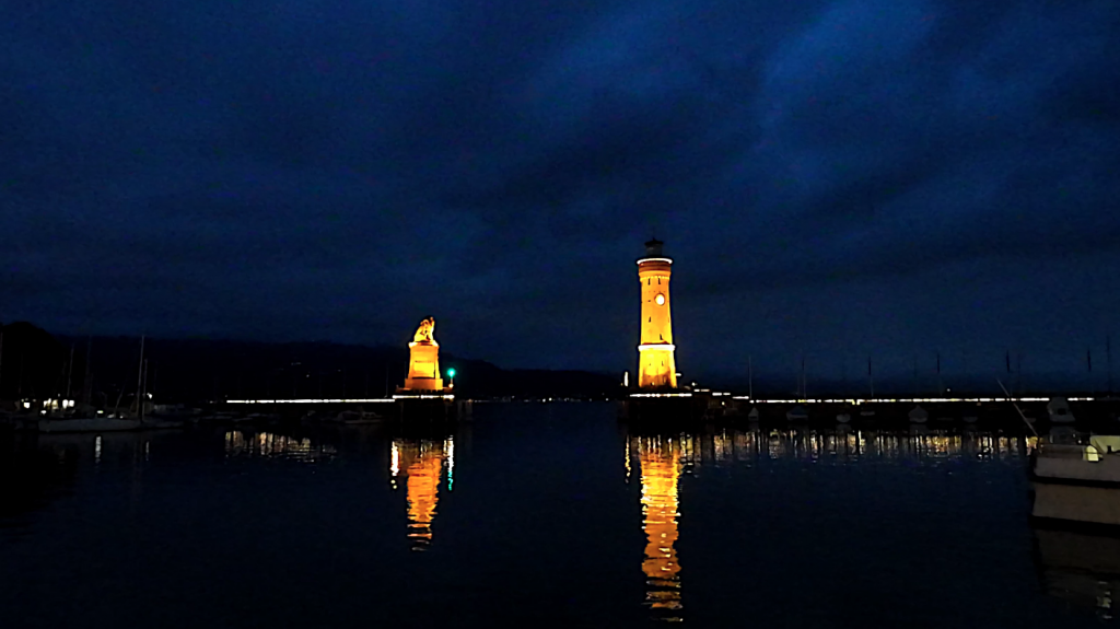 Am späten Nachmittag sind wir noch nach Lindau am Bodensee gefahren, dem offiziellen Startpunkt der Alpenstraße. Natürlich möchten wir kurz über die Insel mit der Altstadt bummeln, aber es ist gar nicht so einfach, einen Parkplatz für Schorschi zu finden. Überall Womo-Verbotsschilder, auch wenn jetzt am Abend eigentlich genug Platz wäre. Nach 20 Minuten haben wir „die Faxen dicke“ und fahren einfach auf den direkt an der Inselbrücke liegenden Großparkplatz, auf dem auch schon 4 andere Wohnmobile stehen. Wir zahlen für 2 Stunden und hoffen, dass heute keine Kontrollen mehr erfolgen, aber wir hätten keine Lust, nur für einen winzigen Spaziergang den 3 km entfernten Stellplatz anzusteuern und für die ganze Nacht zu zahlen. Die Sonne ist schon untergegangen, als wir am Hafen ankommen. Die Abendstimmung ist sehr schön – die Stadt wie ausgestorben, obwohl es Samstag ist und man zumindest Restaurantbesucher erwarten würde. Nach 1 Stunde sind wir schon wieder zurück beim Camper und fahren zur Übernachtung in ein Lindauer Gewerbegebiet.