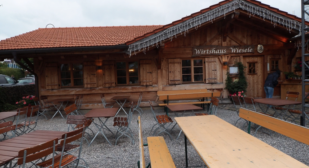 Nun ist es nicht mehr weit bis zu unserem 1. Übernachtungsplatz im Allgäu beim Gasthof Wiesele in Pfronten-Weißbach. 16 € kostet die Übernachtung, Frischwasser und Strom extra, Grau- und Schwarzwasser inclusive. Das Restaurant hat heute Abend genug Platz und so gönnen wir uns ein erstes bayerisches Essen – Almschnitzel und Zwiebelrostbraten, letzter leider mit Zwiebeln in Sauce und nicht schön knusprig. Schlafen können wir hier auf dem Platz aber perfekt.