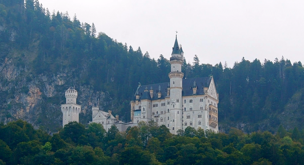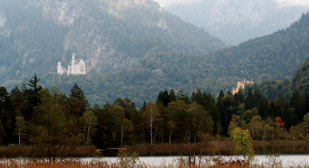Die Wolken direkt über dem Schloss halten sich hartnäckig und ich muss mich mit ein paar Aufnahmen ohne schönes Licht begnügen. Wir wollen noch etwas spazieren gehen und fahren zum kostenlosen Wanderparkplatz am Schwansee. Läuft man zur Westseite des Sees, kann man beide Schlösser – Neuschwanstein und Hohenschwangau sehen. Das Erste spiegelt sich sogar in der glatten Wasseroberfläche und wir absolvieren eine komplette Seeumrundung (3,5 km in ca. 1 Stunde).