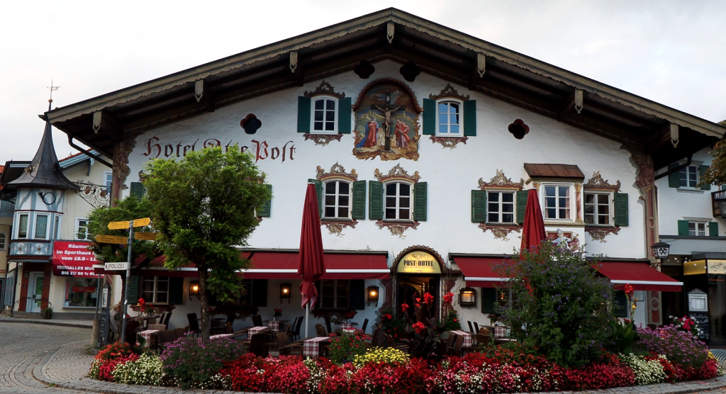 Es ist noch nicht zu spät und so passt noch ein Besuch des Ortes ins Programm. Hier waren wir noch nie und kennen daher nicht die Lüftlmalerei, für die Oberammergau bekannt ist. Ein paar Häuser sind mit den bunten Bildern schön verziert, ich hätte aber mehr erwartet. Der Gasthof Post sieht einladend aus und schon landen wir wieder in einer Gaststube und bestellen – diesmal beide Wiener Schnitzel, das hervorragend schmeckt. Plan ist, in Garmisch-Patenkirchen an der Skischanze auf dem offiziellen Stellplatz für 5 € zu übernachten. Als wir dort recht spät ankommen, ist alles hoffnungslos überfüllt. Wir müssen also weitersuchen und landen am Walchensee. Direkt an der deutschen Alpenstraße gibt es dort zur Gemeinde Jachenau gehörend einen Nachtparkplatz – 15 € bis zum Folgetag 11 Uhr. Es beginnt zu regnen und die Aussichten für den nächsten Tag sind miserabel.