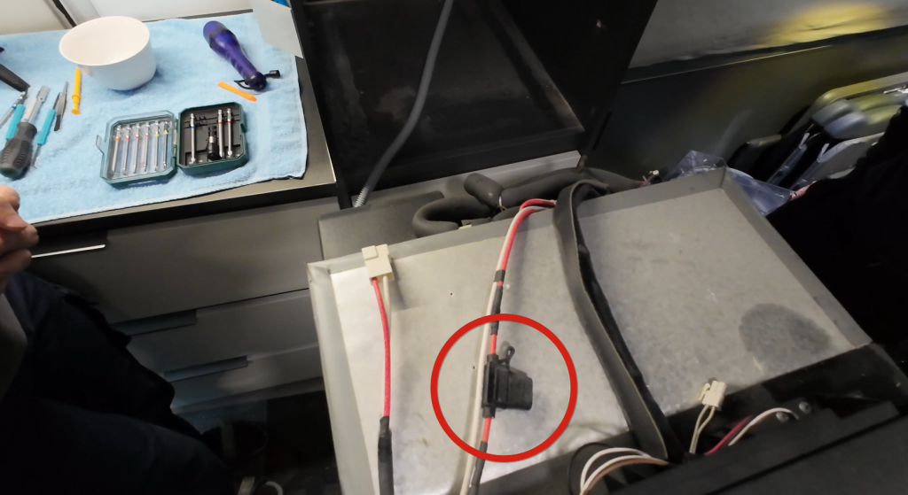 Interessant ist, dass es auf der Kühlschrankoberseite eine weitere 15A-Sicherung in einem schwarzen Sicherungshalter gibt. Sollte das Gerät also mal keinen Strom haben, reicht es nicht, nur die Sicherung im EBL unter dem Fahrersitz zu kontrollieren.