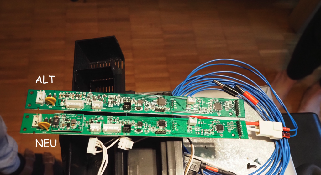 Beim Nebeneinanderlegen der alten und neuen Steuereinheit zeigt sich, dass die Bauform etwas geändert wurde, aber zum Glück haben alle Steckplätze noch denselben Formfaktor, so dass sämtliche Stecker wieder ihren Ort finden. Auch beim Wiedereinsetzen der Platine und der Stecker ist Fingerspitzengefühl von Vorteil, damit man keins der empfindlichen Bauteil beschädigt. Nun nur noch das Gehäuse wieder zusammenbauen und dem ersten Test steht nichts mehr im Wege.