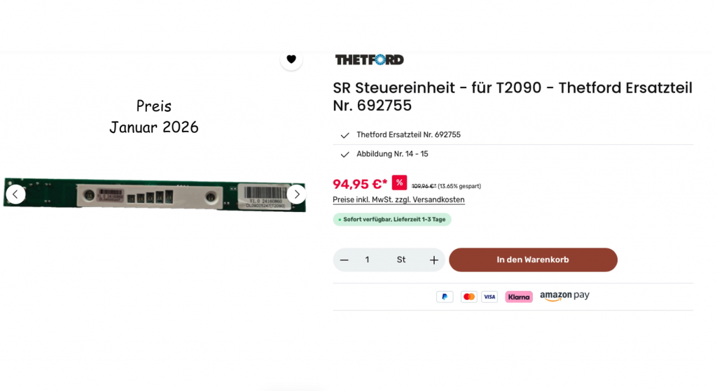 Im Internet finde ich die Website von Thetford, auf der man neben einer Ersatzteilliste auch verschiedene Fehlercodes entdeckt, die auf dem Display angezeigt werden. Letzteres ist bei uns aber nicht der Fall und so checke ich die in Frage kommenden Ersatzteile. Ich bestelle auf die Schnelle das Günstigste, das irgendwie mit dem Fehler zu tun haben könnte. Es ist der Temperaturfühler im Innenraum des Kühlschranks, den es schon für knapp 9 € im Handel zu kaufen gibt.
