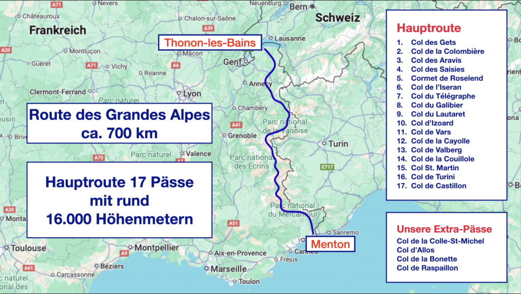 Manche von euch fragen sich vielleicht,  warum wir uns nicht mehr Zeit genommen haben. Einfache Antwort: Die hat es nicht gebraucht. 5 Tage reichen locker für die Hauptroute – wir haben 2 Tage dran gehängt für unsere Extras. Außerdem wussten wir, dass nach 1 Woche das Wetter sehr viel schlechter  werden soll und Sonnenschein ist wirklich das A und O auf der Strecke. Kurz nach unserer Tour hat es in den Hochalpen geschneit und der Col de l’Iseran wurde gesperrt. Also alles richtig gemacht.